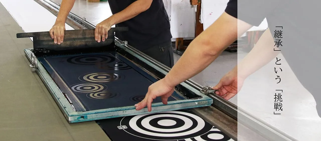 捺染とは、大きな枠に紗(しゃ)を張り、スキージと呼ばれる大きなヘラで染色する本染技法のひとつです。 細かい柄や大量に同じものを染色する際に用います。